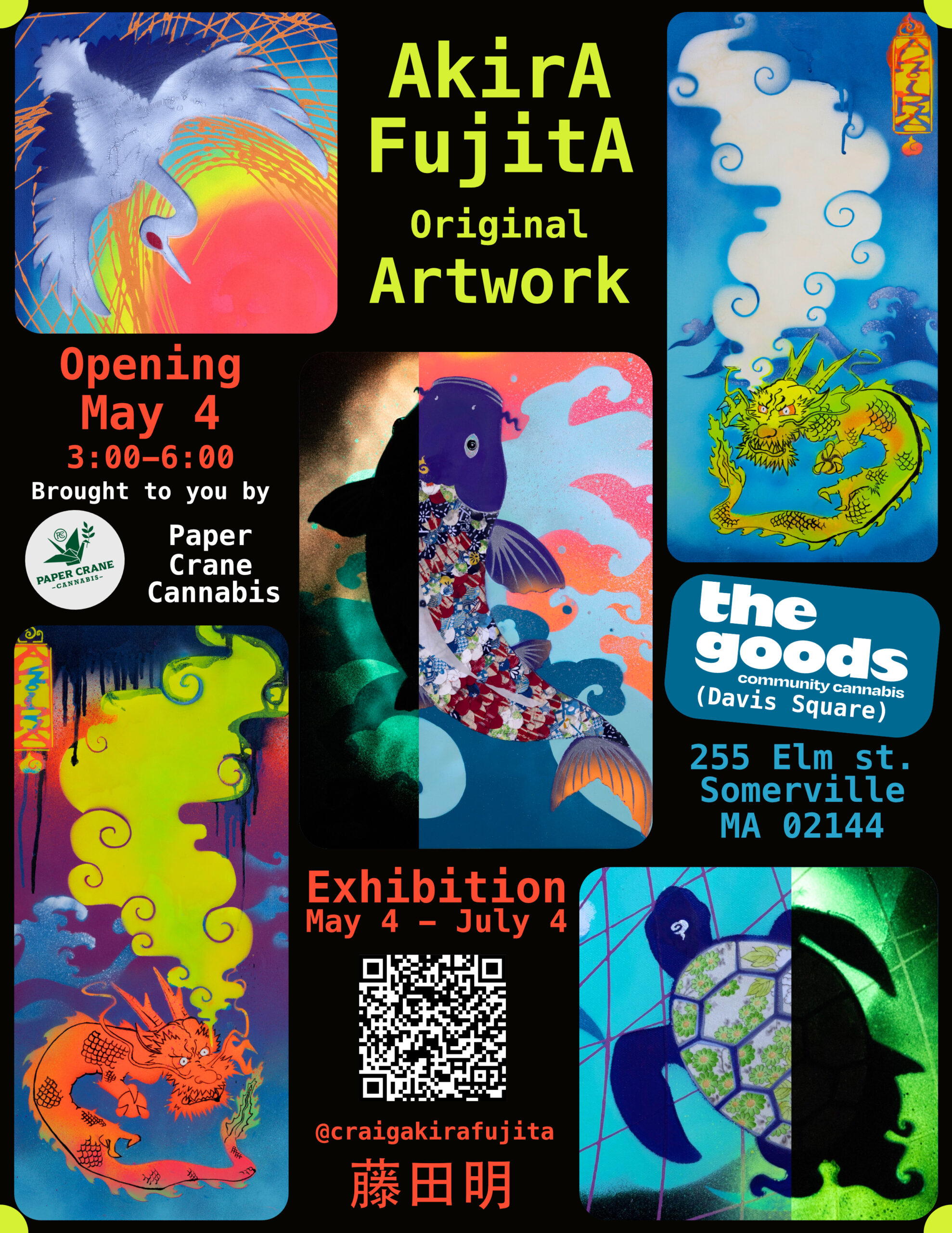 Art Opening in our Community gallery for local Somerville resident/artist/musician Craig Akira Fujita. Please come by and check out some of his new and exciting line of paintings and designs. In collaboration with Paper Crane Cannabis.